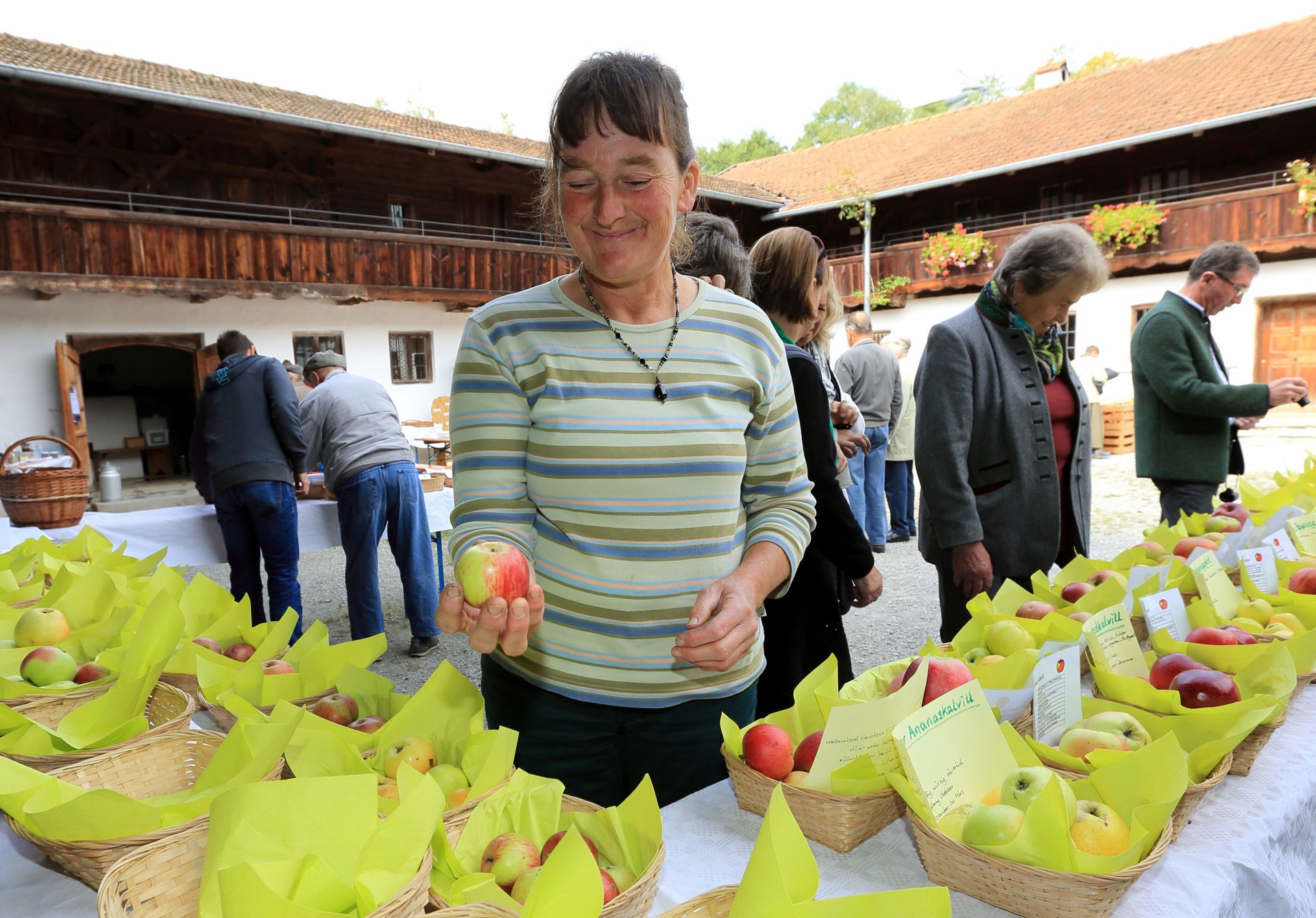 Die Vielfalt der Apfelsorten ist beeindruckend. Ab 11 Uhr bestimmen die Pomologen Maria Seidinger und Georg Loferer mitgebrachte Äpfel und Birnen. Bitte bringen Sie hierfür drei bis fünf Früchte pro Sorte samt Stielansatz und Blättern mit.