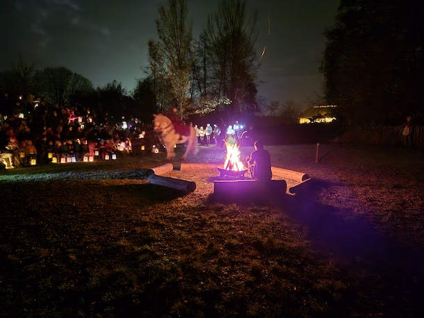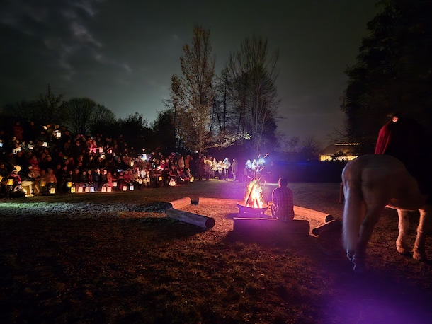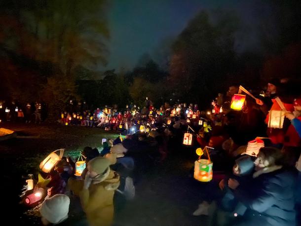 Hinreißend erklangen die St.-Martins-Lieder auf dem gemeinsamen Weg bis zum Mehrgenerationengarten. Die bunten Laternen leuchteten uns den Weg dorthin bis zum Martinsfeuer, an dem die Mantelteilung nachgespielt wurde. Was für uns zum Martinsfest dazugehört, soll die wichtige Botschaft vermitteln: „Den Mitmenschen in der Not helfen.“ Da verstehen auch schon die Kleinsten, dass es nicht darauf ankommt was man teilt, sondern dass ma teilt.