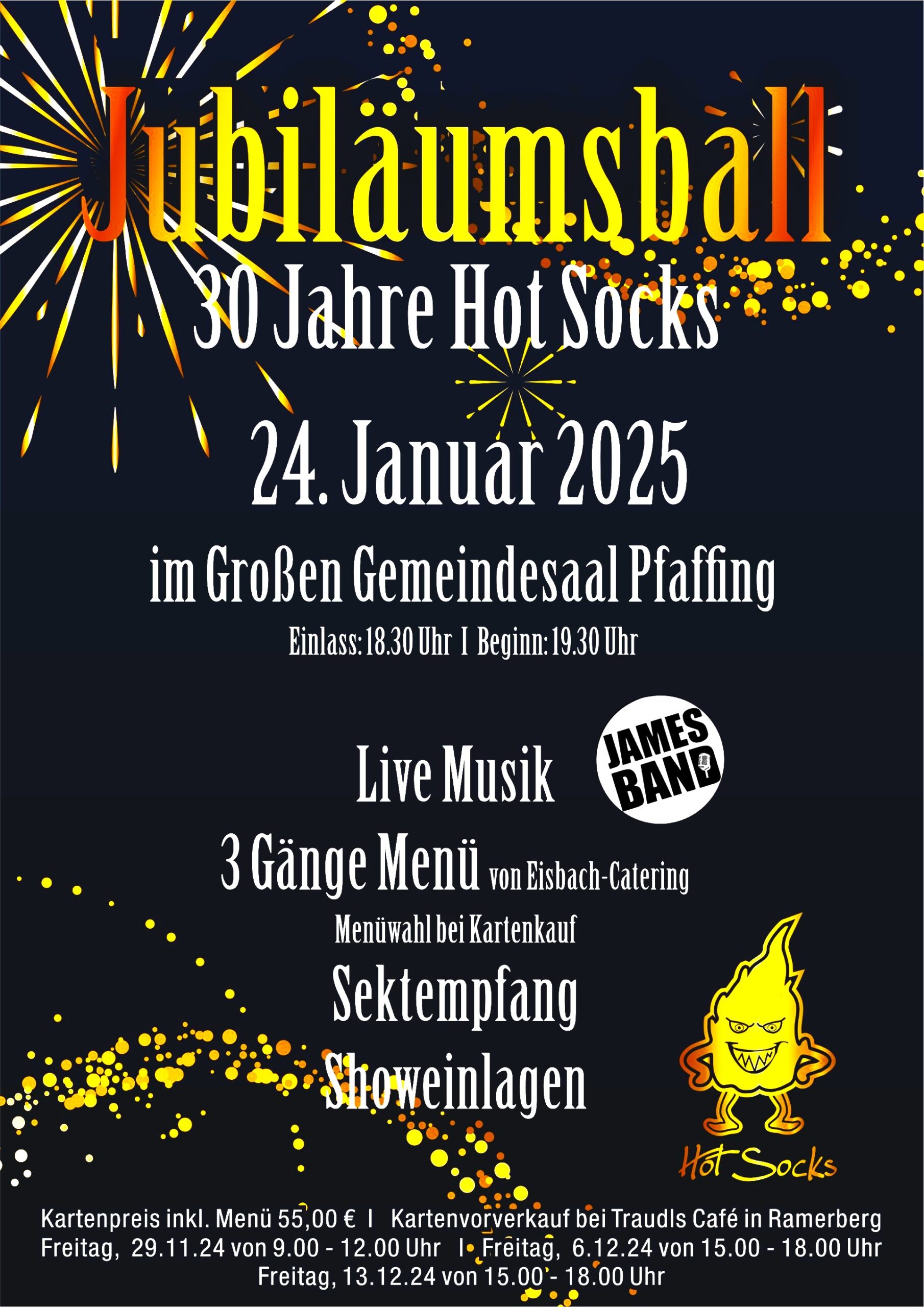 Die „Hot Socks“ laden zum großen Jubiläums-Ball – sie werden 30 Jahre alt. Gefeiert wird am Freitag, 24. Januar, um 19.30 Uhr und zwar im Pfaffinger Gemeindesaal. zum runden Geburtstag gibt’s ein Drei-Gänge-Menü, das die Besucher verwöhnen wird. Für ausgelassene Stimmung auf der Tanzfläche wird die „James Band“ sorgen.