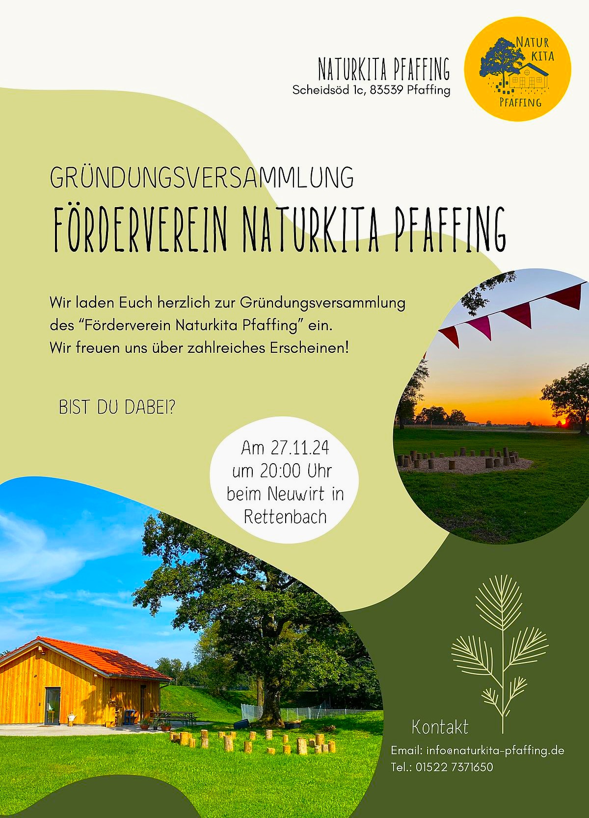 Zur Gründungs-Versammlung eines neuen „Fördervereins Naturkita Pfaffing“ sind alle Interessierten vom Träger – der „Dorfkinder PLUS GmbH“ – am Mittwoch, 27. November, um 20 Uhr beim Neuwirt in Rettenbach eingeladen.