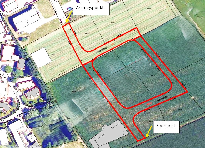 Darum ging es auch am gestrigen Abend im Rotter Gemeinderat: Die neu gebaute, knapp 500 Meter lange Straße im Rotter Gewerbegebiet „am Eckfeld-Ost II“ – der „Gewerbering“ (siehe Foto rot markiert), wie der Straßen-Name lautet – muss als Ortsstraße gewidmet werden, damit die Straße den Charakter einer öffentlichen Straße erhalte.