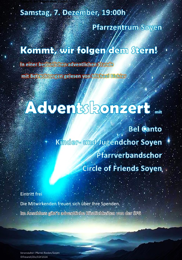Unter dem Motto „Kommt, wir folgen dem Stern!“ lädt die Pfarrei Rieden-Soyen ein zu einer besinnlichen Stunde im Advent ein. Veranstaltungsort ist am nächsten Samstag, 7. Dezember, das Pfarrzentrum Soyen. Einlass ist ab 18.30 Uhr – Beginn der Veranstaltung ist um 19 Uhr. Der Eintritt ist frei, Spenden erwünscht.