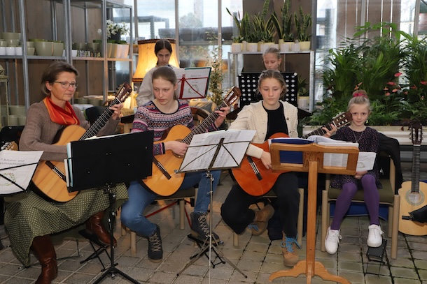Im Innenbereich traten im weihnachtlich geschmückten Zimmerpflanzenhaus verschiedene Musikgruppen auf, und ein Kunststand von Michael und Isabella Wagner bot Linolschnittdrucke und Weihnachtskarten an. HEP-Schüler organisierten zusammen mit Bewohnern einen Waffelstand.