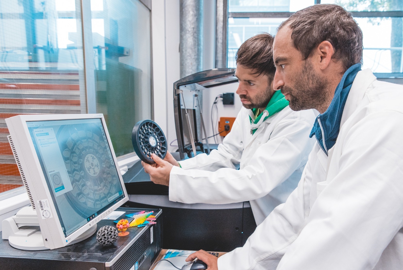Das Foto zeigt das Labor für den 3D-Druck – neu nun auch für Schulungszwecke für kleinere und mittelständische Unternehmen zugänglich. Links im Bild Professor Dr. Fabian Riß von der Fakultät für Ingenieurwissenschaften in Rosenheim.