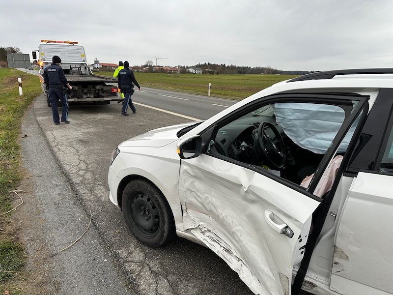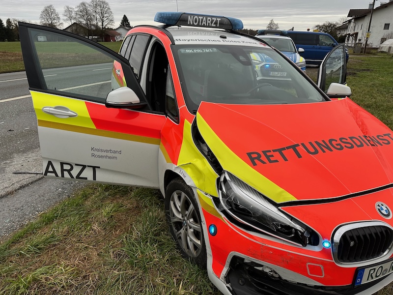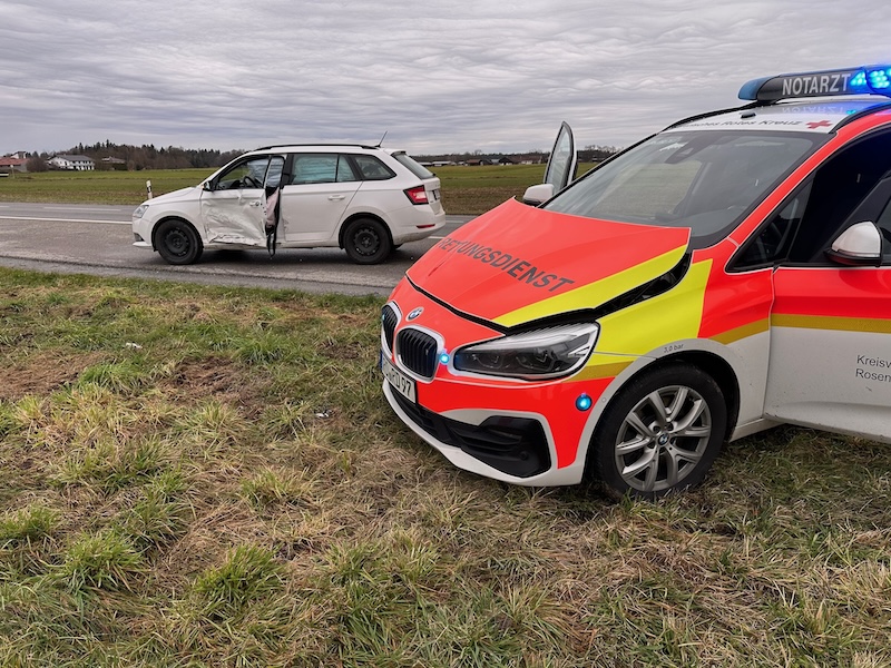 Mit Blaulicht und Martinshorn war am Samstagmittag der Notarzt auf der B304 von Wasserburg in Richtung Forsting zu einem Einsatz unterwegs. Auf Höhe von Edling übersah eine Autofahrerin beim Einbiegen in die Bundesstraße das Rettungsfahrzeug und nahm dessen Fahrer die Vorfahrt. Beide Pkw krachten im Kreuzungsbereich zusammen. Die Autos wurden so schwer beschädigt, dass sie abgeschleppt werden mussten. Den Einsatz musste ein anderer Notarzt übernehmen. Polizeibericht folgt. Fotos: Georg Barth