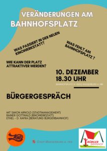 Darüber hinaus soll auch an der Gestaltung des Bahnhofplatzes gearbeitet werden. Um dies gemeinschaftlich mit den Bürgern zu bewerkstelligen, laden Vertreter von Bürger-Bahnhof, „Kinowerkstatt“ und Stadtmanagement die direkten Anwohner sowie alle interessierten Wasserburger sehr herzlich zu einem Vorort-Termin am morgigen Dienstag, 10. Dezember um 18.30 Uhr in die Kinowerkstatt ein.