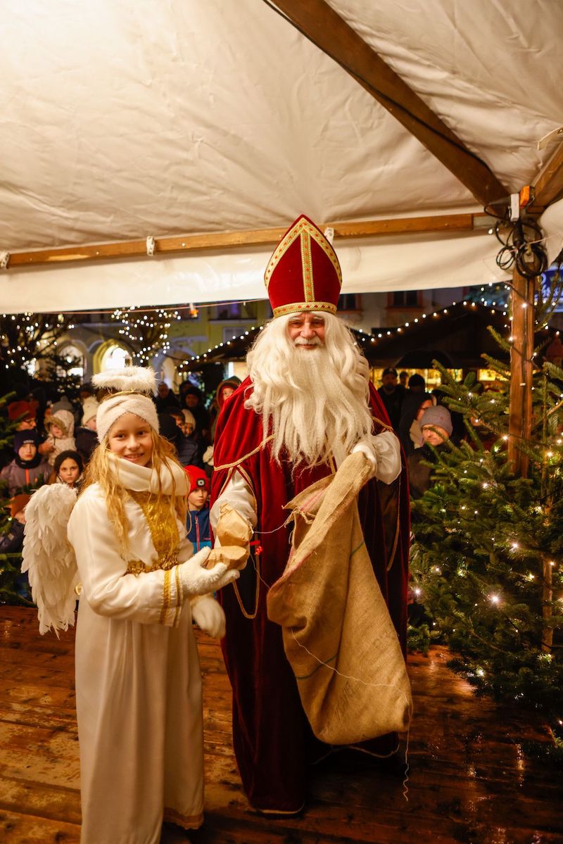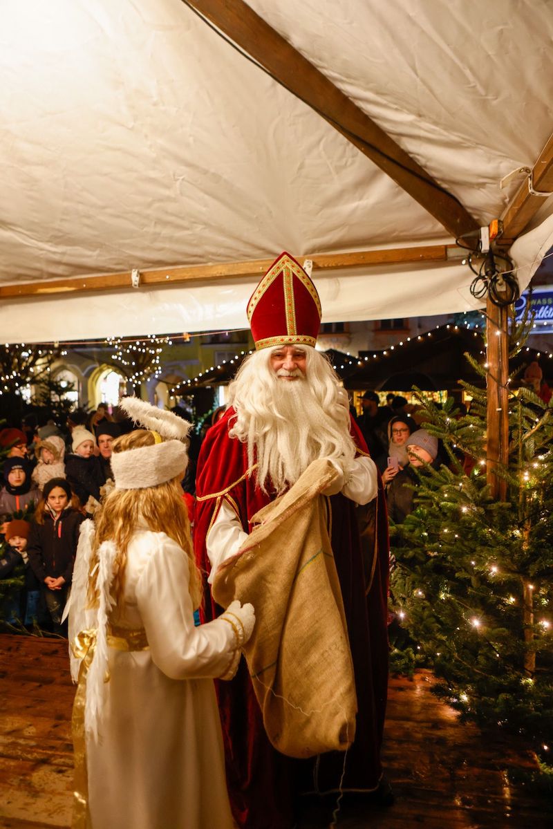 Es schüttete in Strömen – und dennoch kamen die kleine Besucher mit ihren Eltern am Samstag zahlreich zur Winterwaldbühne vor dem Wasserburger Rathaus. Dort verteilte der Nikolaus (Carl-Heinz-Hartmann) zusammen mit dem Wasserburger Weihnachtsengerl Geschenk-Sackerl an die Kinder. Spendiert wurden diese von der REWE-Famlie Sattler. Arthur Sattler (links) übergab sie an den Nikolaus. Der machte sich anschließend wie alle Jahre mit seiner Kutsche auf durch die Altstadt. Fotos: Stefan Pfuhl