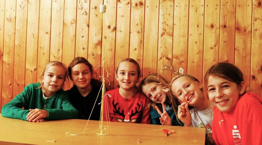 Nach der Begrüßung durch die Trainer Marinus und Jürgen stand für beide Gruppen die sogenannte ‚Marshmallow-Challenge‘ auf der Agenda, bei der die Mädchen und Buben innerhalb von 18 Minuten aus 20 ungekochten Spaghetti, jeweils einem Meter Bindfaden und Kreppband, eine möglichst stabile Konstruktion bauen sollten, auf die – on top – ein Marshmallow platziert werden sollte.