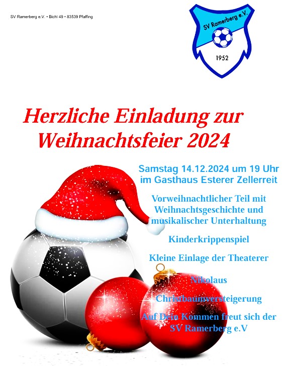 Darauf freuen sich schon viele Mitglieder, denn die Organisatoren scheuen weiß Gott keine Mühen: Am kommenden Samstag, 14. Dezember, um 19 Uhr findet die Weihnachtsfeier des SV Ramerberg beim Wirt in Zellerreit statt. Ein vorweihnachtlicher Teil mit Weihnachtsgeschichte und musikalischer Unterhaltung, ein Kinder-Krippenspiel und die alljährliche Christbaumversteigerung versprechen einen bekannt kurzweiligen und geselligen Abend.
