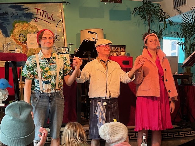 Unter der Regie von Nik Mayr spielten drei Akteure zehn Personen als „Frühstücks-Live-Hörspiel“. Rosalie Schlagheck spielte in höchst berührender Weise den Wutz, den Pinguin Ping, den Direktor Dr. Zwengelmann und die Riesenkrabbe. Sie tat dies mit besonderem Sprachwitz, der die Zuschauer zwischen 5 und 75 Jahren immer wieder zu lang anhaltenden Heiterkeitsbekundungen hinzureißen vermochte. Es war ein Genuss, Rosalie Schlagheck bei ihren sprachlichen Verrenkungen, die die verschiedenen Rollen von ihr verlangten, zu verfolgen, auch wenn dem Zuschauer dies nicht immer zu gelingen schien. Der Pinguin Ping blieb nachhaltig im Ohr, sorgten doch die die Zischlaute, die als „sch“ ausgesprochen werden sollten, aber als „pf“ ausgesprochen wurden, immer wieder für großen Applaus. Doch auch Carsten Klemm, der den Professor Habakuk Tibatong ebenso gekonnt mimte wie den Seele-Fant, einen See-Elefanten oder Andreas Hagl, der die Rollen von Tim Tintenklecks, Wawa Waran, Urmel und König Futsch verkörperte, verstanden es in beeindruckender Weise, das Publikum auf die Insel „TiTiWu“ zu entführen und hier auch ein wenig anzukommen. Bei den Klängen von „Jamaica Farewell“, mit denen die Vorführung begann, erschienen manchem Besucher sicher schon die lauen Wellen der Karibik vor dem geistigen Auge.