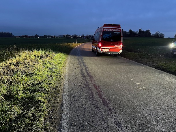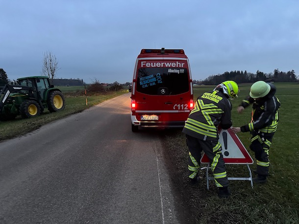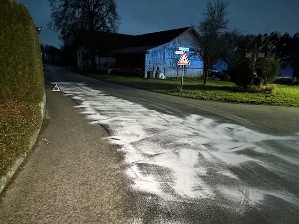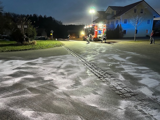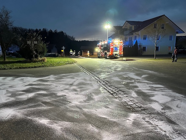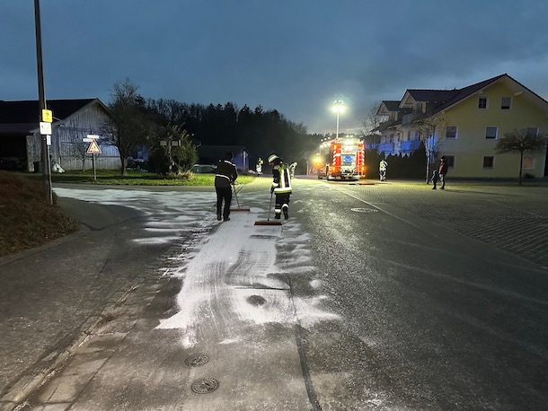 Alarm für die Feuerwehr Albaching am Donnerstagnachmittag: Gegen 16.30 Uhr mussten die Floriansjünger auf die Gemeindestraße in Kalteneck ausrücken. Dort hatte ein defekter Traktor eine breite Ölspur verursacht. Die Feuerwehr brachte Bindemittel aus und reinigte die Fahrbahn. Fotos: Georg Barth