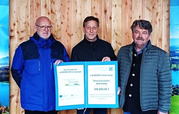 Eine vorzeitige Bescherung gab es jetzt für die Gemeinde Amerang. Der Vorsitzende der LAG Chiemgauer Seenplatte – Sepp Reithmeier (rechts) – und der LEADER-Koordinator am Amt für Ernährung, Landwirtschaft und Forsten in Rosenheim, Johann Kölbl (links) haben an den Ameranger Bürgermeister Konrad Linner (Bildmitte) einen Förderbescheid über stolze 180.000 Euro überreicht.