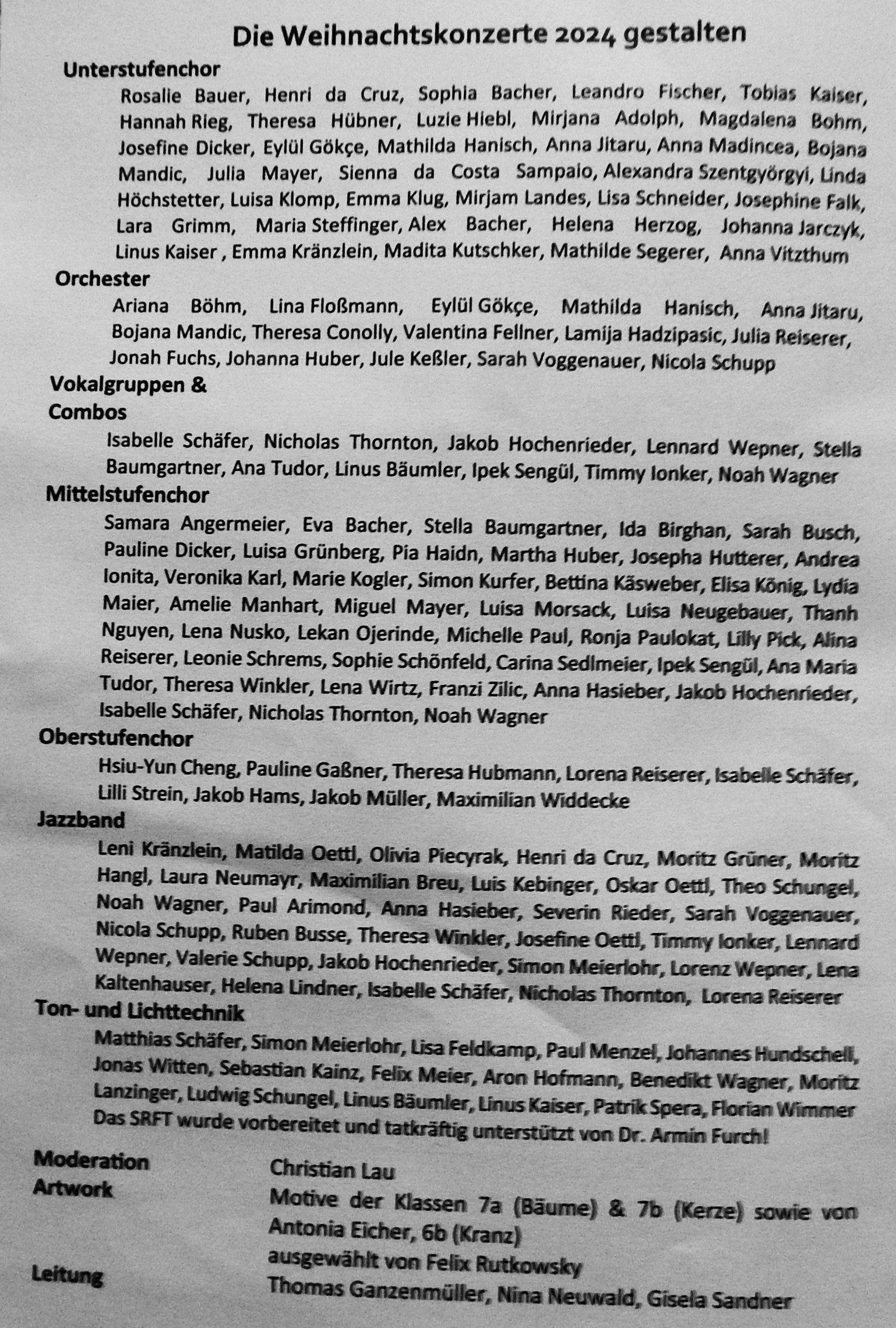 Und hier noch alle (eigentlich, wenn nicht leider erkrankt) mitwirkenden Schüler und Schülerinnen des Weihnachtskonzerts 2024 des Gymnasiums Wasserburg auf einen Blick:
