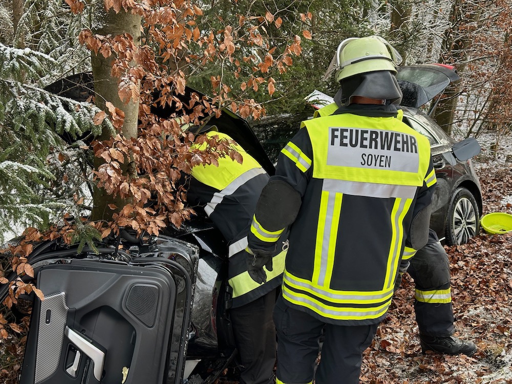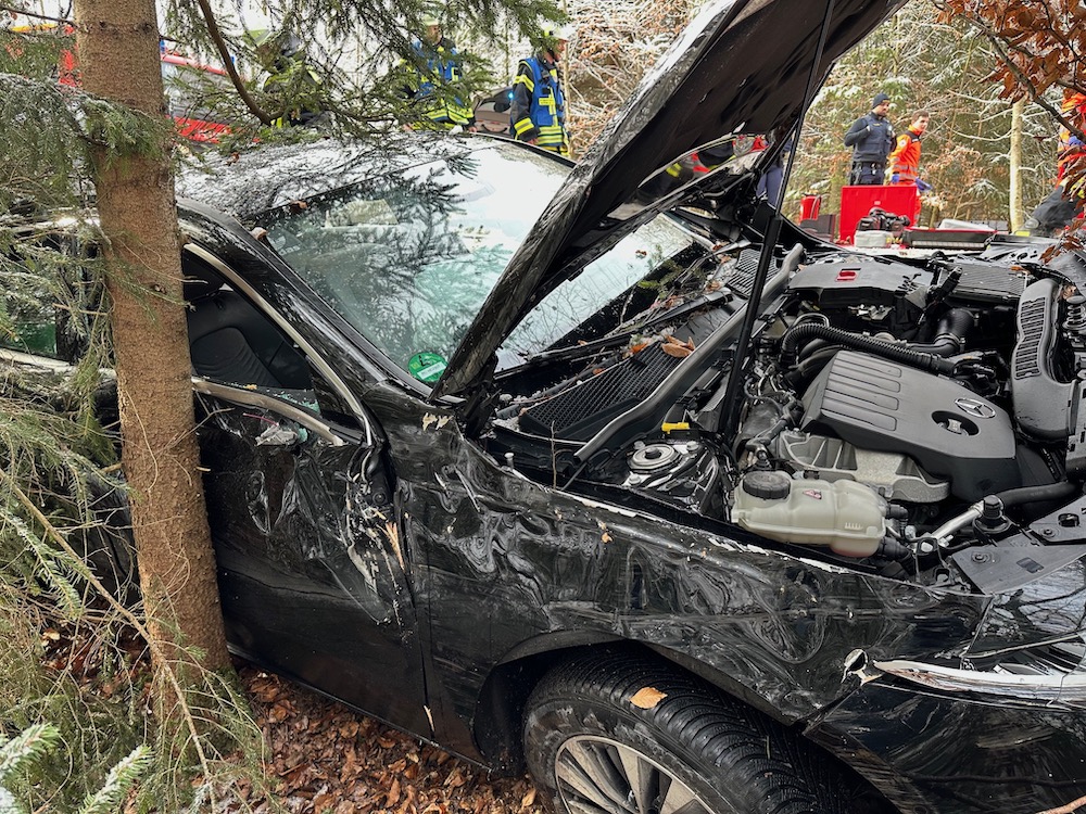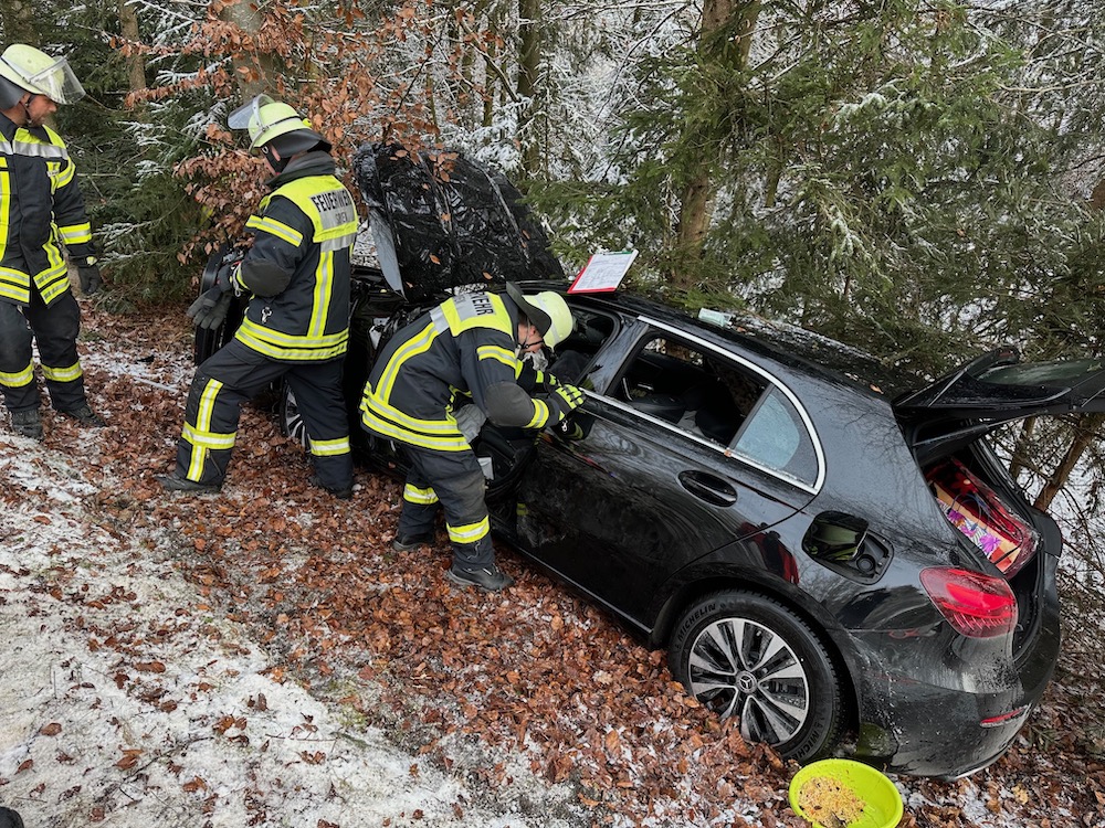 Für die Dauer des Einsatzes sowie Bergung des Fahrzeugs musste die Kreisstraße für knapp zwei Stunden gesperrt werden.