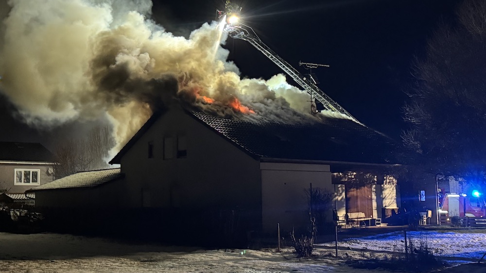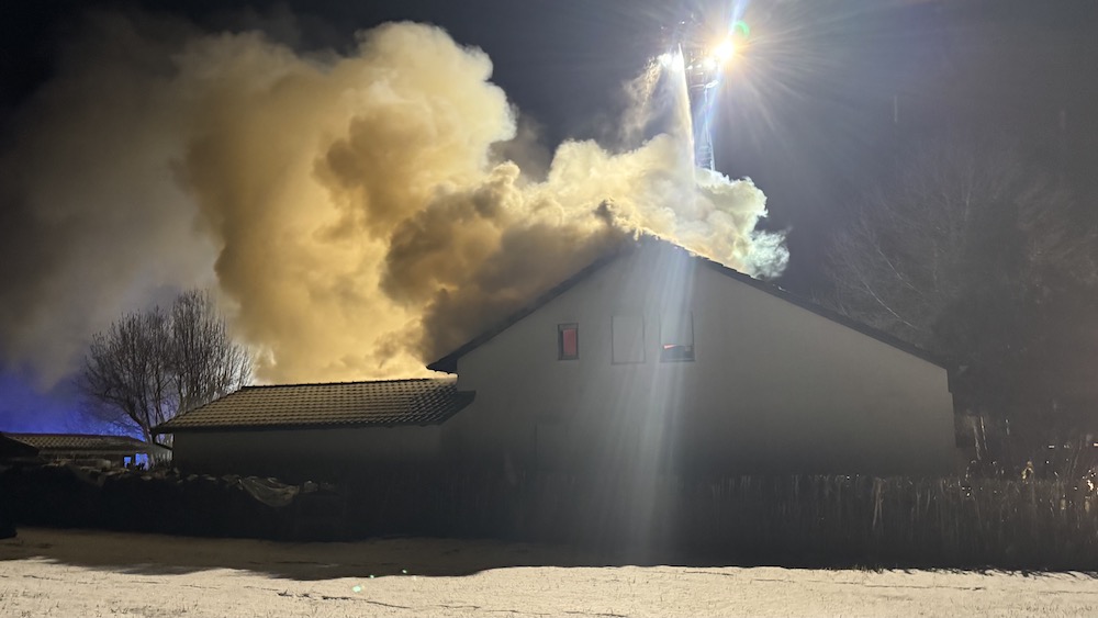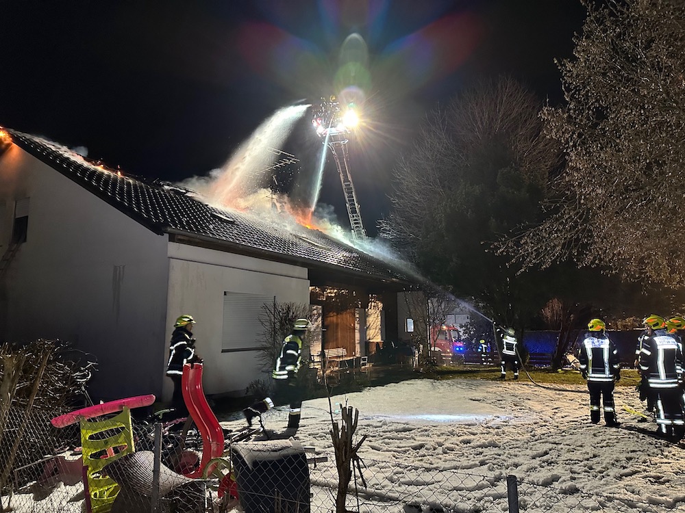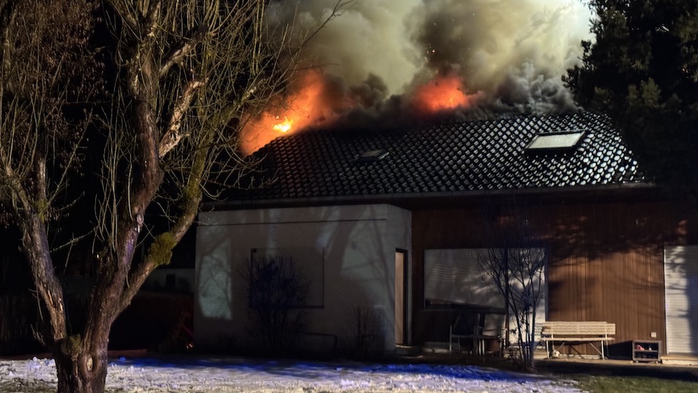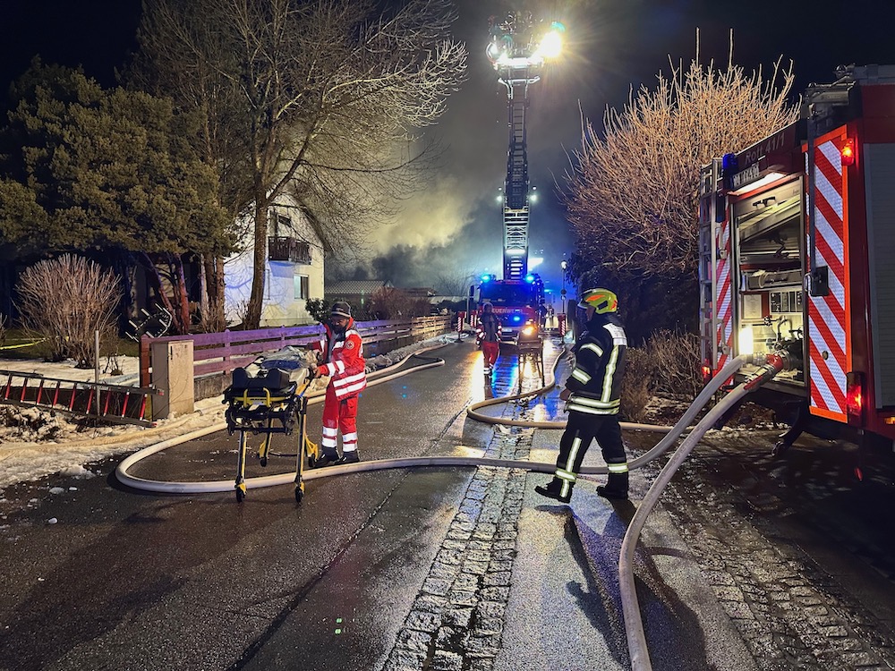 Gegen 6 Uhr morgens kam die Meldung: Zimmerbrand in einem Gebäude in der Alpenstraße in Griesstätt. Als die Einsatzkräfte nur wenige Minuten später dort eintrafen, stand bereits der Dachstuhl lichterloh in Flammen.