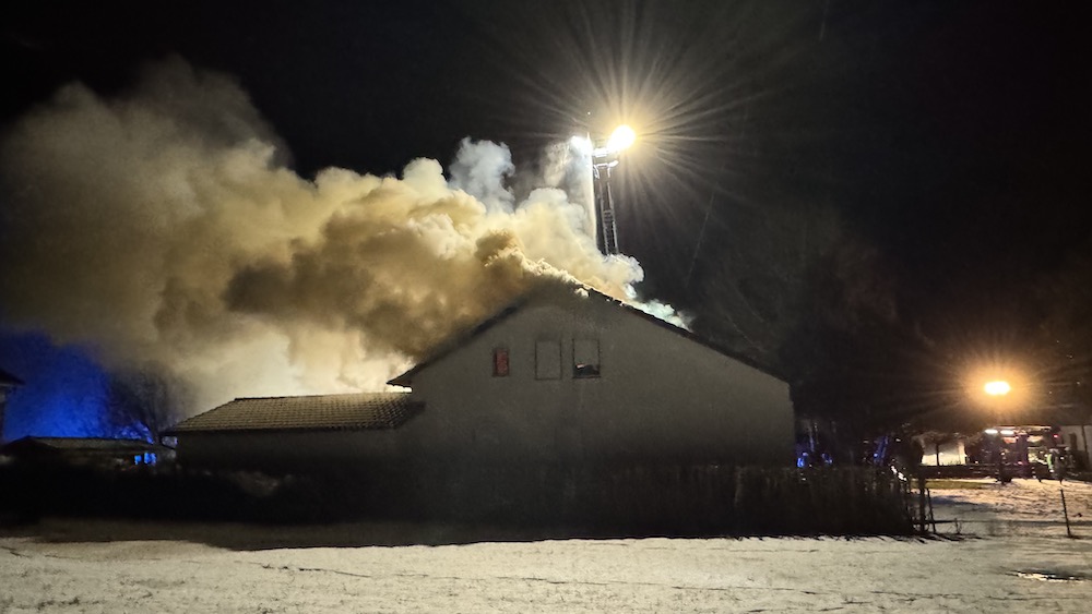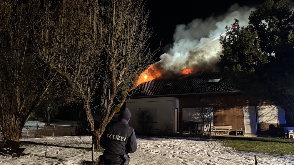 Gegen 5.50 Uhr ging bei der Integrierten Leitstelle Rosenheim die Mitteilung über den Brand in einer dezentralen Asylbewerberunterkunft in der Alpenstraße in Griesstätt ein. Bei Eintreffen der sofort alarmierten regionalen Feuerwehren stand der Dachstuhl des betroffenen Objekts bereits im Vollbrand. Durch das rasche und professionelle Eingreifen der Einsatzkräfte konnte ein Übergreifen der Flammen auf benachbarte Gebäude verhindert werden. Im Zuge der aufwendigen Löscharbeiten wurde das Feuer vollständig abgelöscht.