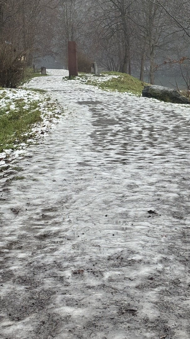 Er ist Wasserburgs beliebtes Naherholungsgebiet – der Inndamm. Seit gestern „geht“ auf dem Otto-Geigenberger-Weg allerdings für Fußgänger nichts mehr. Der gesamte Damm ist komplett vereist. Zertrampelter Schnee, angefroren, aufgetaut und wieder angefroren – diese Abfolge führt dazu, dass die Dammkrone aktuell die reinste Rutschbahn ist.