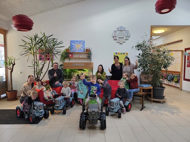 Es wird „rasant“ im Außenbereich des Griesstätter Kindergartens. Denn in der ersten Kindergartenwoche des neuen Jahres gab es eine schöne Überraschung für die Kinder: Der Fuhrpark wurde um vier Tretfahrzeuge erweitert. „Die Kids haben die Fahrzeuge gleich in Beschlag genommen und sind Probe gefahren. Da gab es viele leuchtende Augen“, erzählt Katharina Spötzl. Die Vorsitzende des Elternbeirats durfte die vier Tretbulldogs gemeinsam mit Stephan Huber, dem Vorsitzenden des Fördervereins des Kindergartens, an die Einrichtung übergeben.