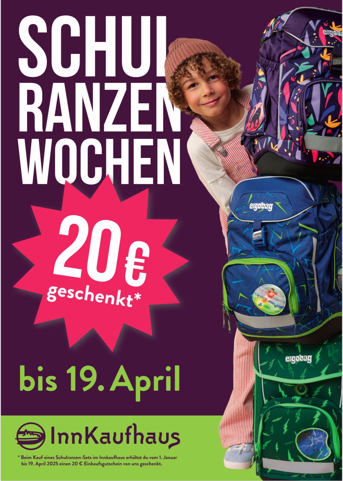 - 20-Euro-Gutschein: Bei jedem Schulranzenkauf erhält man einen 20-Euro-Gutschein, den man im Innkaufhaus für weitere Einkäufe nutzen kann.