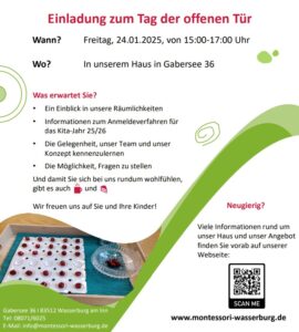 Ein Tag der offenen Tür findet am Freitag, 24. Januar, von 15 bis 17 Uhr im Montessori-Haus für Kinder im Haus 36 in Gabersee statt. Die Besucher erhalten einen Einblick in die Räumlichkeiten, Informationen zum Anmeldeverfahren für das Kita-Jahr 25/26 sowie die Gelegenheit, das Team und das Konzept kennenzulernen.