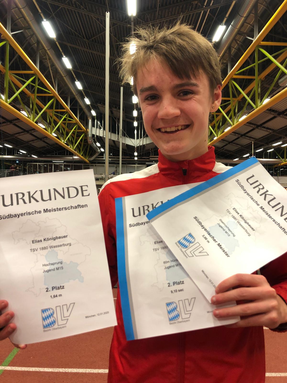 Der zweite fleißige Medaillensammler in dieser Altersklasse war Elias Königbauer. Mit insgesamt drei Medaillen und drei neuen Bestleistungen konnte er zufrieden die Heimreise antreten. In seinem dritten Stabhochsprung Wettkampf übersprang er erstmals die drei Meter Marke und holte sich damit den Südbayerischen Meistertitel vor Jonathan Obermeier von der LAG Mittlere Isar. Mit einer neuen Bestleistung von 1,64 Metern holte er sich im Hochsprung hinter Christian Hylla von der LG Sempt die Vizemeistermeisterschaft. Seine dritte Medaille mit einer Vizemeisterschaft sicherte er sich über die 60-Meter Hürden mit 9,10 Sekunden, wo er nur knapp hinter dem Sieger Norbert Zampieri lag.