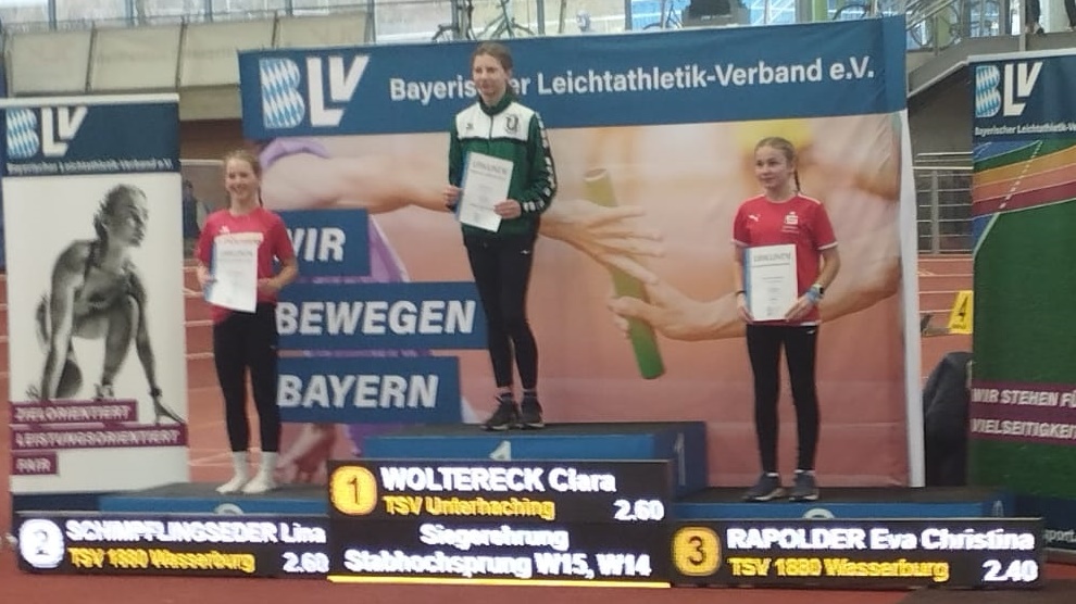 Zwei weitere Medaillen gehen auf das Konto der beiden Stabhochspringerinnen Lina Schimpflingseder und Eva Rapolder. Sie erkämpften sich die Silber und die Bronze Medaille im Stabhochsprung der W14. Lina übersprang 2,60 Meter und war damit höhengleich mit der Siegerin Clara Woltereck vom TSV Unterhaching. Sie musste sich nur aufgrund von mehr Fehlversuchen mit der Vizemeisterschaft zufriedengeben. Eva überquerte 2,40 Meter und konnte sich damit über die Bronze Medaille freuen.