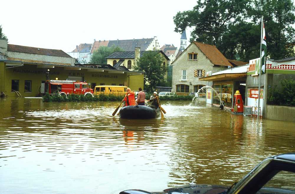 „Telekom-Anbau am Postgebäude“, während der Bauzeit, 1991. Unten: Im Bildhintergrund Bahnhof, Rampe und BayWa-Turm. Oben: Blick vom Parkhaus Überfuhrstraße.