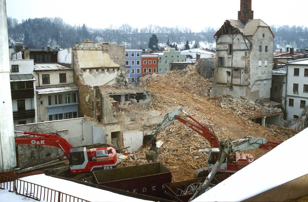 Ehemalige Brauerei Grein unmittelbar vor und während des Abrisses, Sommer 1995, Winter 1995/96.