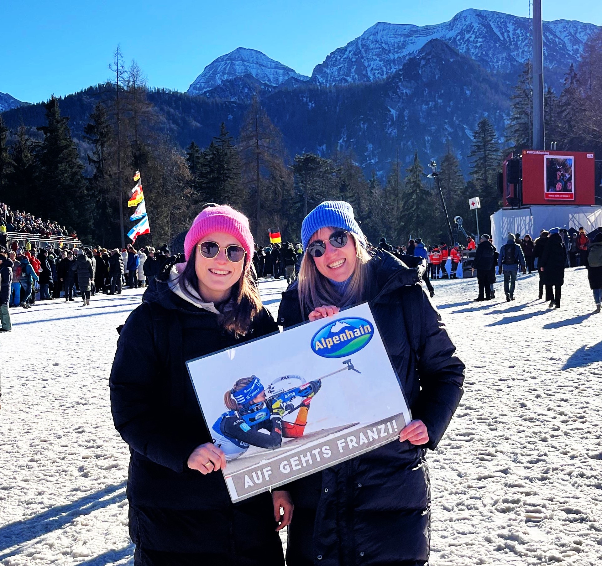 Alpenhain-Support am vergangenen Wochenende vor Ort in Ruhpolding: Das familienunternehmen hat die Gelegenheit des Heimweltcups genutzt, um die Markenbotschafterin anzufeuern – im Bild unten Sandra Schmid (links) und Magdalena Weber, beide vom Vertriebsinnendienst bei Alpenhain in Lehen in der Gemeinde Pfaffing.