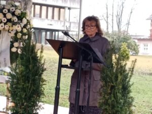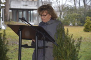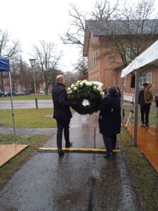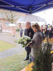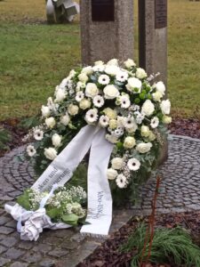 Anschließend legte sie am NS-Mahnmal einen Kranz nieder. Die Pflegedirektorin des kbo-Inn-Salzach-Klinikums, Kerstin Weinisch, rezitierte ein Gedicht von Nelly Sachs und bat alle Anwesende um eine Schweigeminute zu Ehren der über 700 Opfer der Euthanasiemaßnahmen der Nationalsozialisten in Wasserburg, Gabersee und Attel.