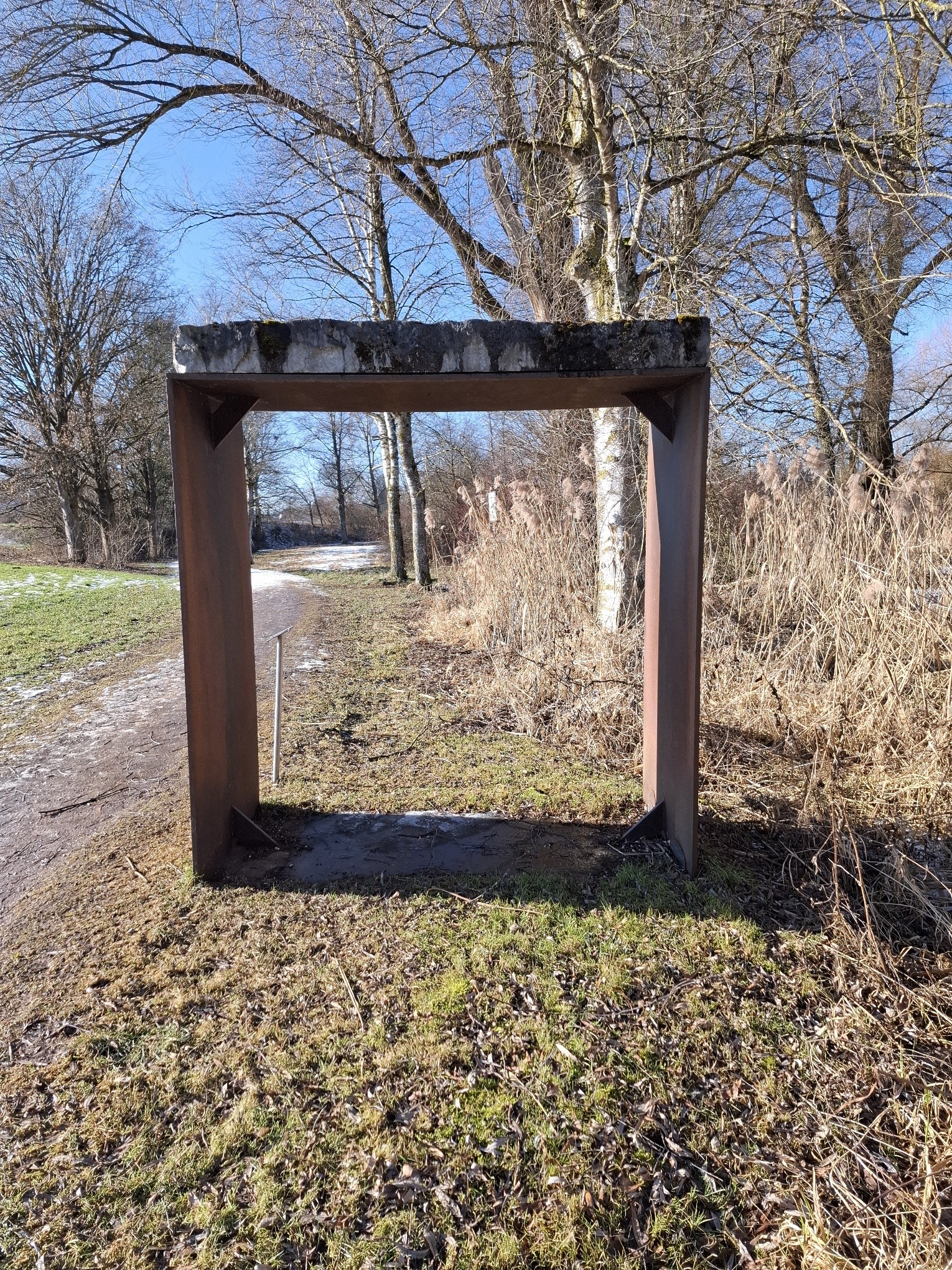Neben der Idylle der Landschaft gibt es einen sehenswerten Skulpturenweg – ganz eben und gut drei Kilometer lang. Das Foto zeigt zum Beispiel das dortige Kunstwerk mit dem Titel „Das Tor“ …