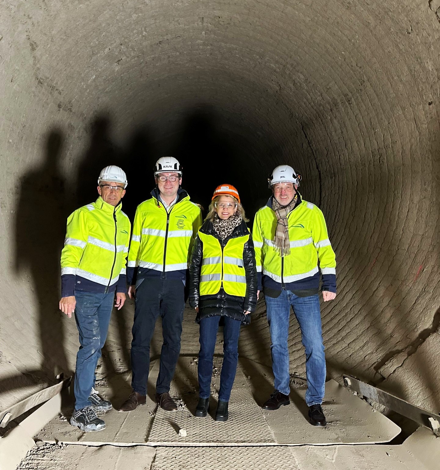 Zum Foto: Im Drehrohrofen des Zementwerkes – von links Kaufmännischer Leiter (Sparte Zement) Günther Wunsam, Kaufmännischer Leiter Rohrdorfer Gruppe – Kai Junghänel – MdB Daniela Ludwig und Geschäftsführer Mike Edelmann.