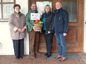 Anstelle eines großen Spendenschecks übergaben der Präsident des Wasserburger Lions-Clubs, Tobias Hutterer (zweiter von links) und Clemens Sturm (rechts), mitverantwortlich im Club für die Organisation des Konzertes, symbolisch einen kleinen Korb mit Gemüse. Die Sparkassenüberweisung dazu erfolgte natürlich umgehend.