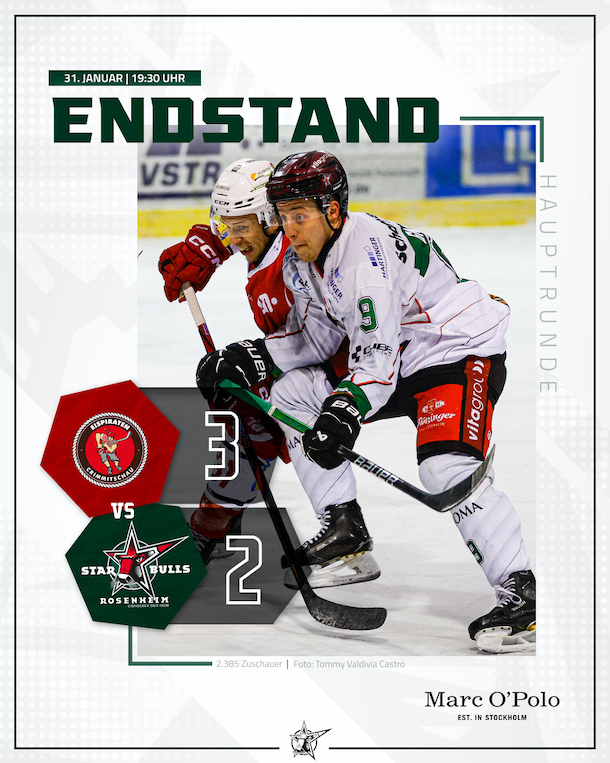 Am 42. Spieltag der DEL2 traten die Starbulls Rosenheim zum Auswärtsspiel gegen die Eispiraten Crimmitschau stark ersatzgeschwächt an. Cheftrainer Jari Pasanen konnte nur noch vier Verteidiger aufbieten und nominierte ein Stürmer-Quartett aus der Nachwuchsriege. Trotzdem waren die Starbulls den fast optimal aufgestellten Hausherren vor 2.385 Zuschauern im Kunsteisstadion im Sahnpark nicht nur ebenbürtig, sondern über weite Strecken die bessere Mannschaft. Die Rosenheimer Tore von Lukas Laub und Shane Hanna reichten aber am Ende nicht. Die Eispiraten stellten mit einem Doppelschlag zu Beginn des letzten Drittels die Weichen auf Sieg und behielten knapp und glücklich mit 3:2 die Oberhand.