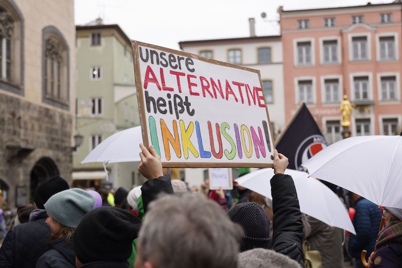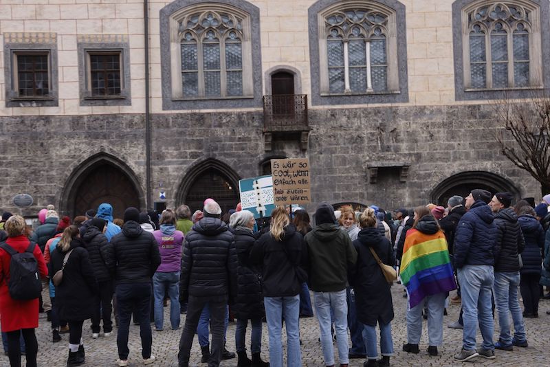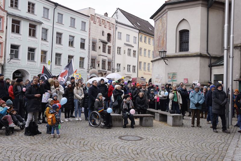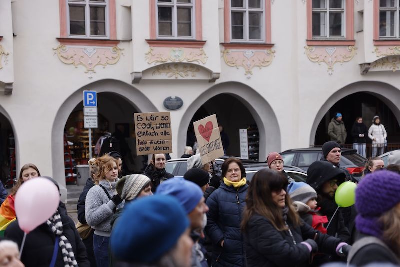 Die Teilnehmer versammelten sich trotz Kälte und kurzfristiger Ankündigung in Wasserburg, um gemeinsam ein deutliches Zeichen gegen Rechts, für Vielfalt, Menschlichkeit und Demokratie zu setzen. Hand in Hand umschlossen sie das Rathaus – ein eindrucksvolles Bild der Solidarität, begleitet von bunten Luftballons, Fähnchen und Schildern, die die Vielfältigkeit und den Zusammenhalt symbolisierten.