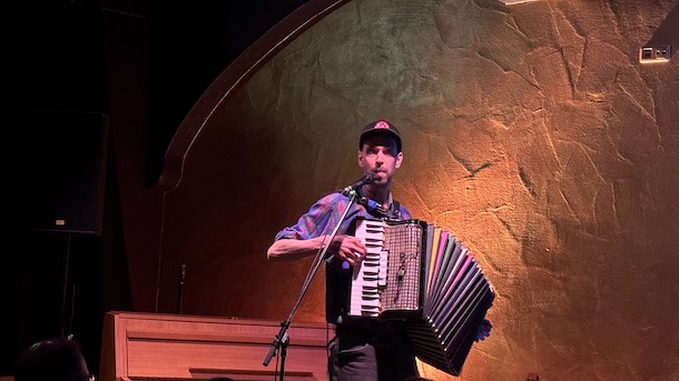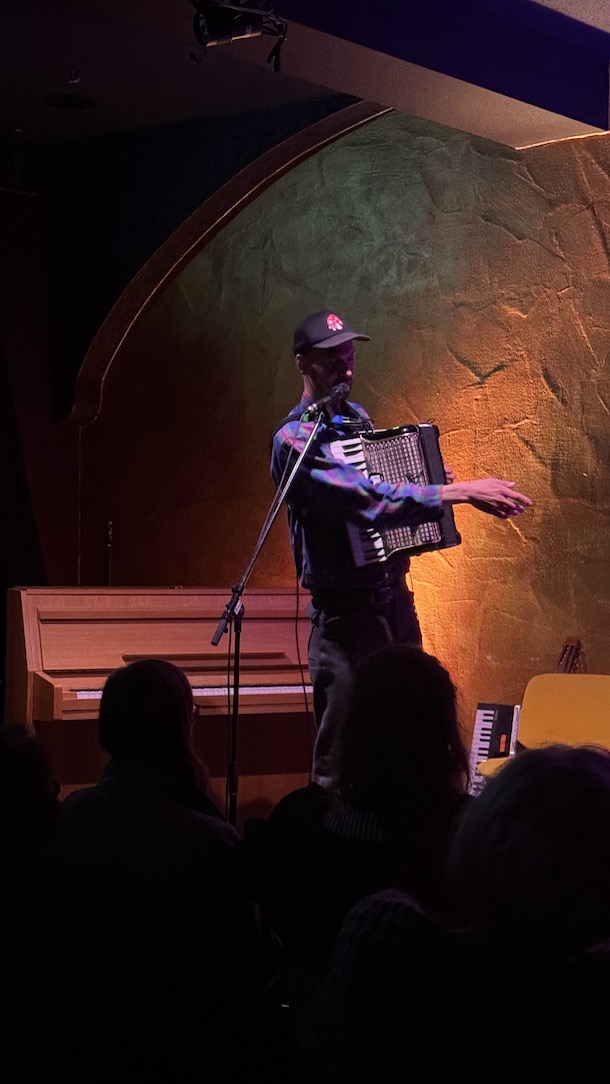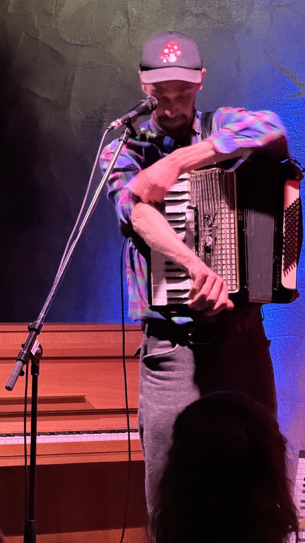 „Kofelgschroa“ macht schon seit sechs Jahren Pause. Maxi Pongratz tut das nicht. Er muss musizieren. Die Musik muss raus aus ihm. Sonst zerreißt es ihn. Ihn, der ohnehin schon „ziemlich ausgefranst“ ist, wie er selbst von sich sagt. Das ureigene Akkordeonspiel von Maxi Pongratz, seine Kompositionen und nicht zuletzt seine dadaistisch- und valentinesk genannten Texte prägten Sound- und Erscheinungsbild von „Kofelgschroa“. Und sie sind jetzt, bei seinen Soloauftritten, sein ganz eigenes, markantes Markenzeichen. Wie der legendäre Fredl Fesl jongliert er dabei mit Worten, bringt sie beim Reden ein bisschen holprig und mit Pausen raus, was sehr charmant wirkt und dem Publikum Zeit zum Verschnaufen verschafft. Ponkratz, das verrät er auch an diesem Abend selbst, ist „Stotterer“. Und er hat deshalb ein „Stotterlied“, was eigentlich widersinnig ist, denn beim Singen ist vom Stottern nichts zu merken.
