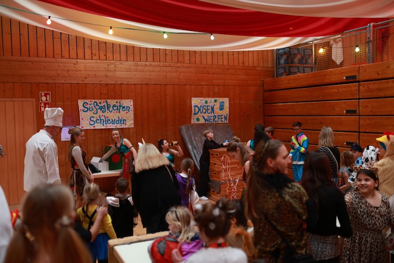 Dieses Jahr bekam jedes Kind am Einlass Gutscheine, die es einlösen konnte bei mehreren Spielstationen – wie Dosenwerfen, dem Drehen am Glücksrad oder bei einer Süßigkeiten-Schleuder und beim Buttons-Basteln.