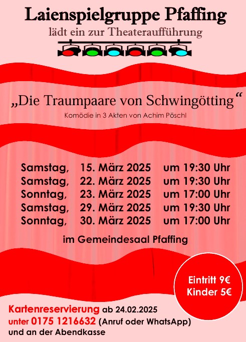 Ja, es wird wieder lustig im Gemeindesaal in Pfaffing: „Die Traumpaare von Schwingötting“ – diese Komödie in drei Akten von Achim Pöschl ist das neue Stückl der Pfaffinger Theaterer. Die Premiere wird am Samstag, 15. März, um 19.30 Uhr sein.