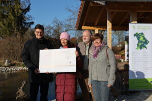 Bürgermeisterin Sissi Schätz (im Bild rechts) freute sich über das Engagement von Margot Erber, die nun auch Öle aus heimischen Ölsaaten herstellt. Landrat Max Heimerl (im Bild links) und Thomas Einwang, Vorsitzender der Öko-Modellregion Mühldorf überreichten den Scheck für die Förderung.