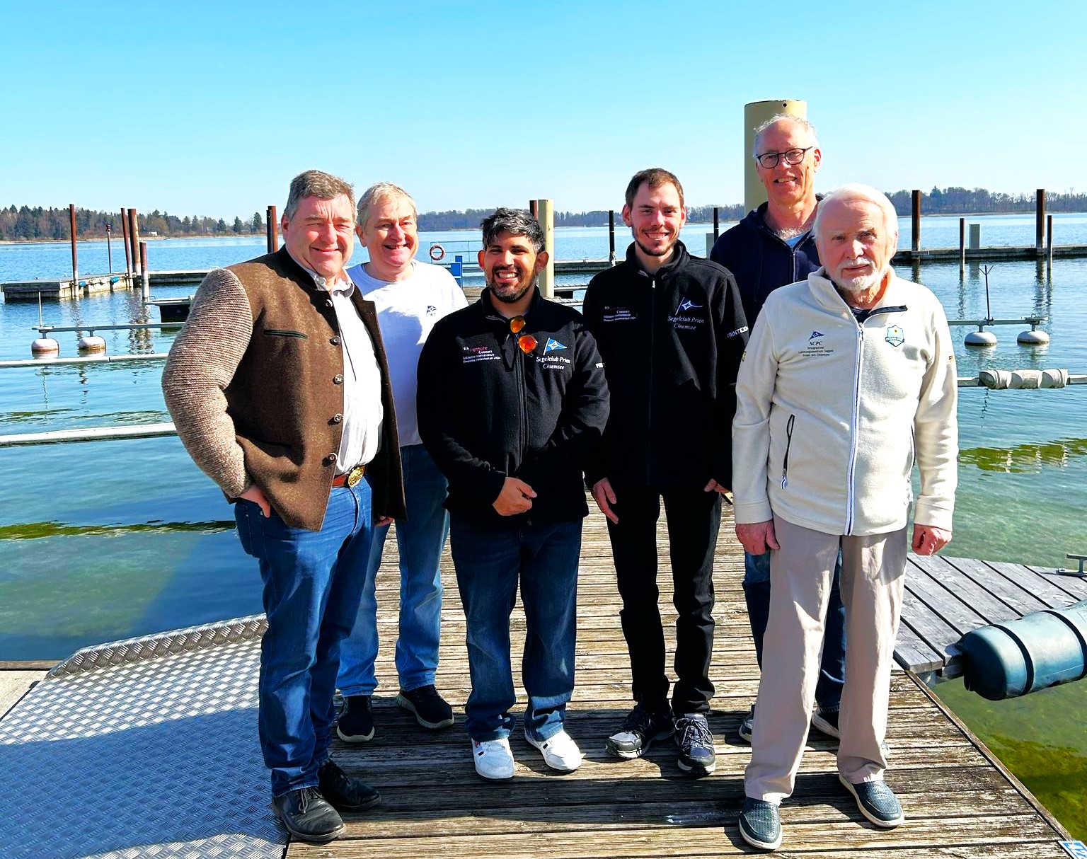 Das Foto zeigt den Landtags-Abgeordneten Sepp Lausch (links) mit der Vorstandschaft des Segelclubs Prien am Chiemseehafen.