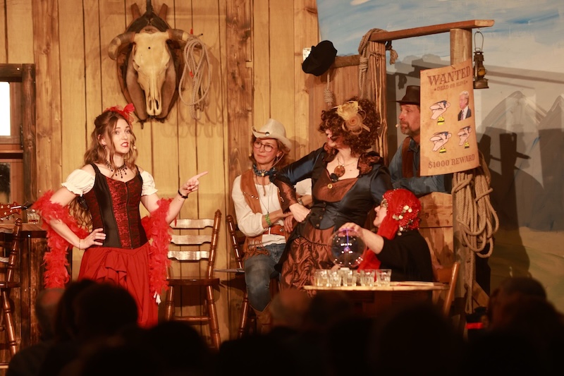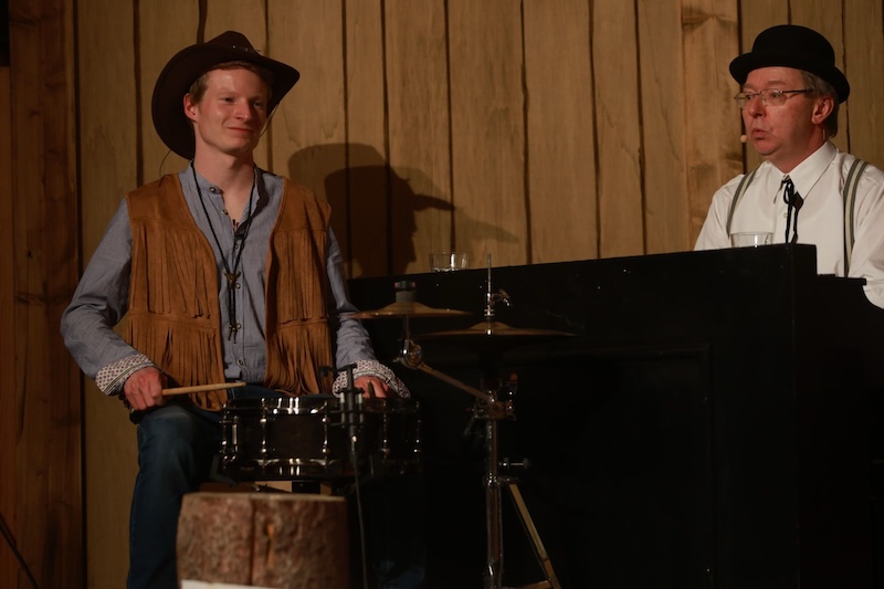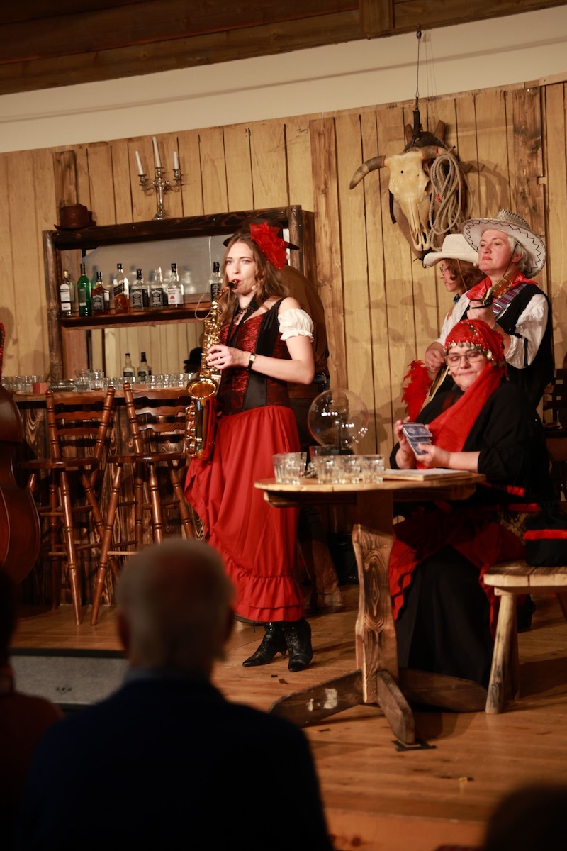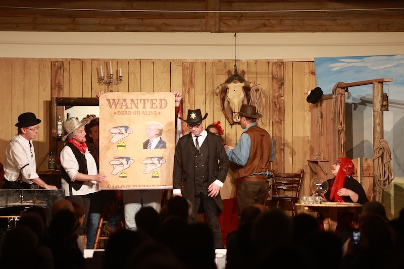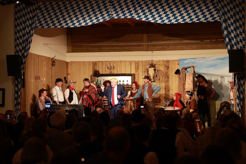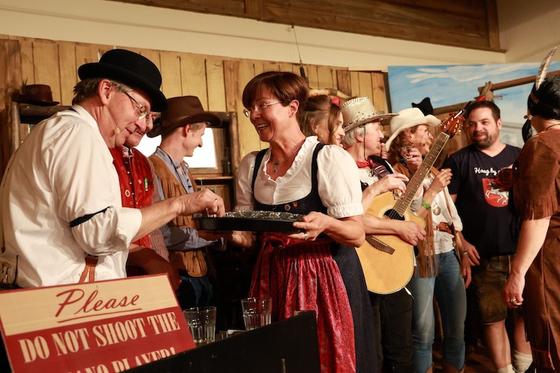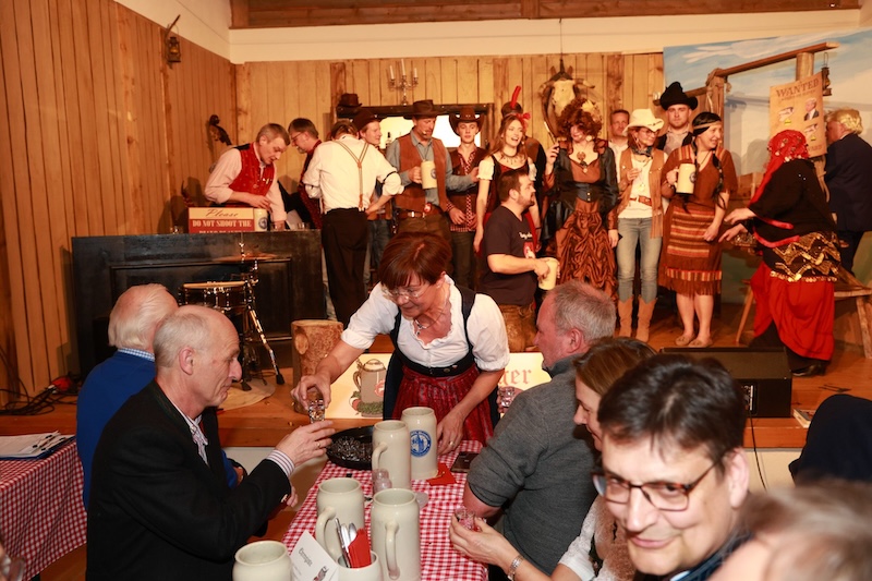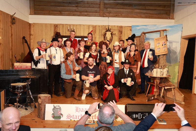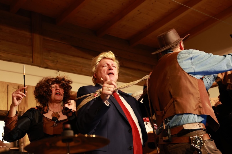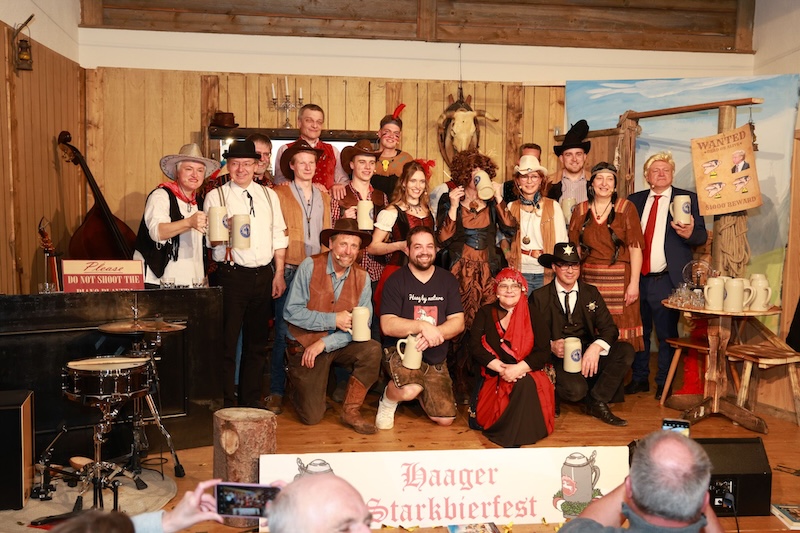 Sie reisten extra mit ihrer Zeitmaschine in die Epoche des Wilden Westens zurück – doch auch den Haagern gelang es gestern nicht, Trump in den USA zu verhindern. Und das, obwohl sie seinen Großvater Frederick Trump (brillant dargestellt von Bernd Furch) fesselten, mit Feuerwasser abfüllten und letztlich sogar kidnappten. Enkel Donald Trump war – man kann es täglich im Fernsehen begutachten – einfach nicht aufzuhalten. Das schmälert allerdings nicht den Erfolg des Singspiels beim Haager Starkbierfest, für das gestern im vollbesetzten Grandls Hofcafe der Startschuss gegeben wurde – mit vollem Erfolg und einem am Ende vor Begeisterung jubelndem Publikum.