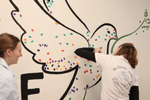 Die Schülerinnen und Schüler, aber auch das Lehrerkollegium des Gymnasiums Gars, hatten am Aktionstag die Möglichkeit, ihren Daumenabdruck auf eine an die Wand gemalte Friedenstaube zu tupfen und damit ein Zeichen gegen Krieg und für den Frieden zu setzen. Jeder Fingerprint musste mit einem Obolus von zwei Euro (nach oben waren alle Grenzen offen) abgeglichen werden.
