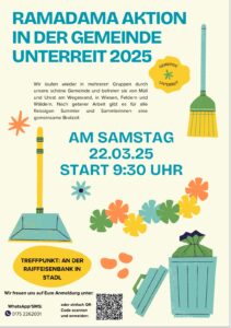 Am kommenden Samstag, 22. März, findet die „Ramadama“-Aktion in der Gemeinde Unterreit statt. Treffpunkt ist um 9.30 Uhr an der Raiffeisenbank in Stadl.