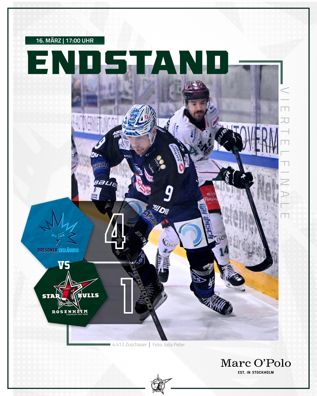 „Im Großen und Ganzen haben wir gut gespielt, aber es gab zu viele Momente, in denen wir nicht playoffreif waren“, sagte Starbulls-Cheftrainer Jari Pasanen nach der Partie. Am Dienstag muss seine Mannschaft nun im zweiten Heimspiel gegen die Eislöwen einen Sieg erzwingen und den ersten Dresdner „Matchpuck“ zum Einzug ins Playoff-Halbfinale abwehren. Spielbeginn im ROFA-Stadion ist am Dienstag um 19.:30 Uhr (Eintrittskarten: www.starbulls.de/tickets und ab 17.30 Uhr an der Stadionkasse).