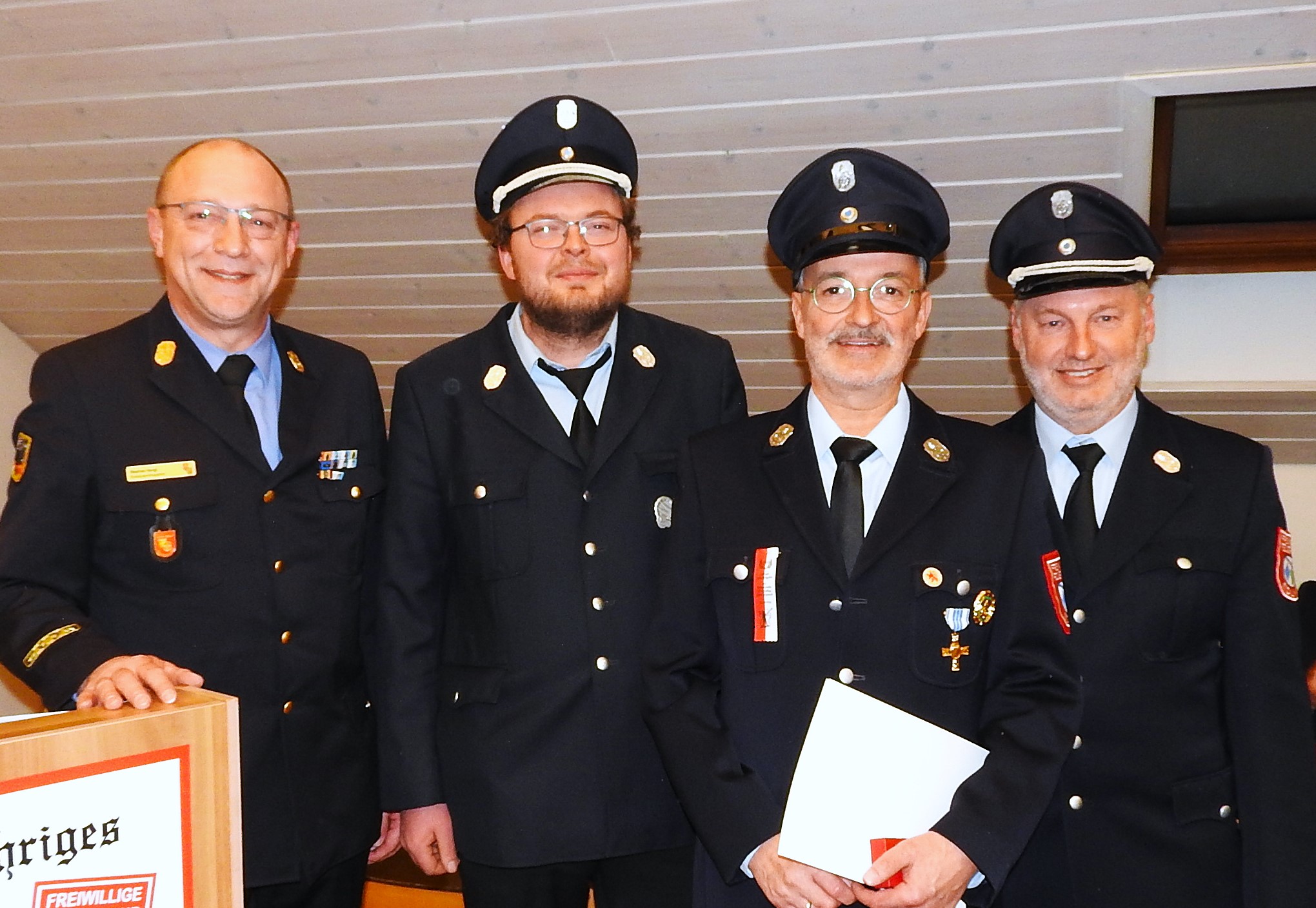 Kreisbrandinspektor Stephan Hangl, der die Ehrungen vornahm, Kommandant Vinzenz Hauke, Matthias Schnetzer und 2. Kommandant Günther Wieser.