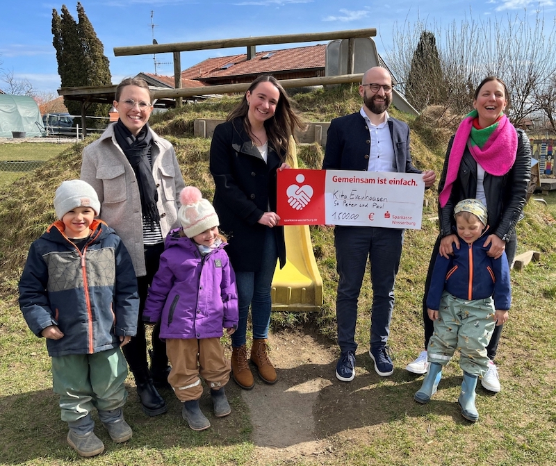 Große Freude im Kindergarten Evenhausen: Die Sparkasse Wasserburg am Inn hat eine Spende in Höhe von 1.500 Euro überreicht, um den Kauf eines neuen Klettergerüsts zu unterstützen. Im vergangenen Jahr zerstörte ein heftiger Sommersturm das bisherige Klettergerüst vollständig. Umso größer ist nun die Erleichterung, dass mit Spenden bald ein neuer Spielbereich für die Kinder geschaffen werden kann. Die symbolische Scheckübergabe fand in der Kindertagesstätte statt.