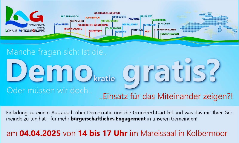 Demokratie gratis – so lautet ein Wettbewerb für bürgerschaftliches Engagement in den Gemeinden. Ob Schulaktion, künstlerischer Ansatz, Wirtshausgespräch, Kinoabend, Diskussionsmarathon, Flash-Mob, Marktplatz-Gespräch: Es gibt viele Möglichkeiten, das Thema ehrenamtliches Engagement für die Demokratie vor Ort sichtbar zu machen. Die LAG Mangfalltal-Inntal startet dazu einen Wettbewerb – der Auftakt ist am kommenden Freitag, 4. April, um 14 Uhr im Mareis-Saal in Kolbermoor. Zu gast ist der Demokratie-Botschafter und Kabarettist Christian Springer.