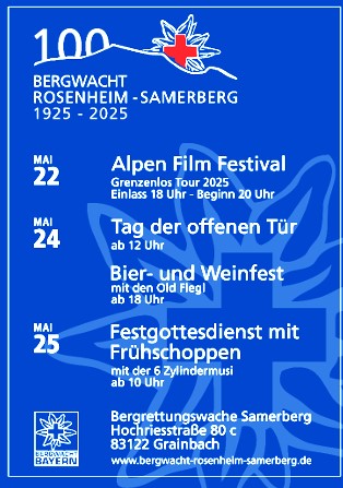 Ein rundes Jubiläum, das gefeiert werden will: Die Bergwacht Rosenheim-Samerberg wird 100 Jahre alt. Von Donnerstag, 22. Mai, bis Sonntag, 25. Mai, erwartet die Besucher rund um die Bergrettungswache Samerberg ein vielseitiges Programm mit spannenden Einblicken und gemütlichem Beisammensein.