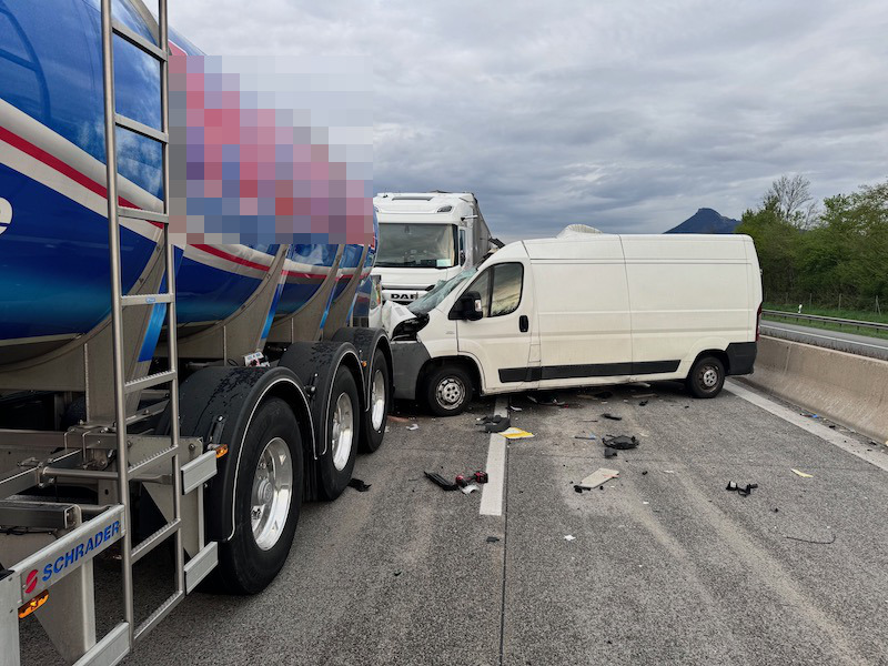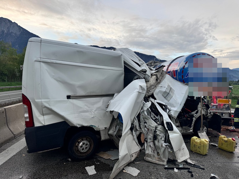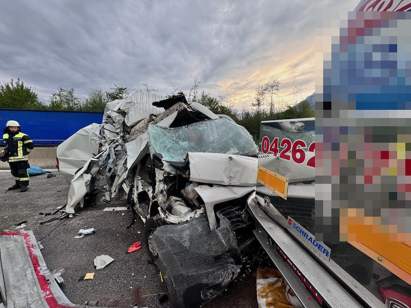 Gegen 5.45 Uhr kam es heute auf der A93 in Fahrtrichtung Kufstein kurz vor der Anschlussstelle Kiefersfelden zu einem schweren Verkehrsunfall, in den ein Kleintransporter mit polnischem Kennzeichen sowie zwei Sattelzüge verwickelt waren. Aufgrund der Blockabfertigung am Grenzübergang Kufstein durch die Tiroler Behörden staute sich ab 5 Uhr der Lkw-Verkehr auf der rechten Fahrspur. Der Fahrer eines Kleintransporters übersah vermutlich aus Unachtsamkeit das Stauende und versuchte dem stehenden Sattelzug auf der rechten Fahrspur auszuweichen wobei er die Kontrolle über sein Fahrzeug verlor. Im Anschluss stieß das Fahrzeug zunächst in das Heck des Sattelzugs, schleuderte anschließend gegen eine Betonfahrbahntrennung und dann zurück gegen den ersten sowie einen weiteren Sattelzug.