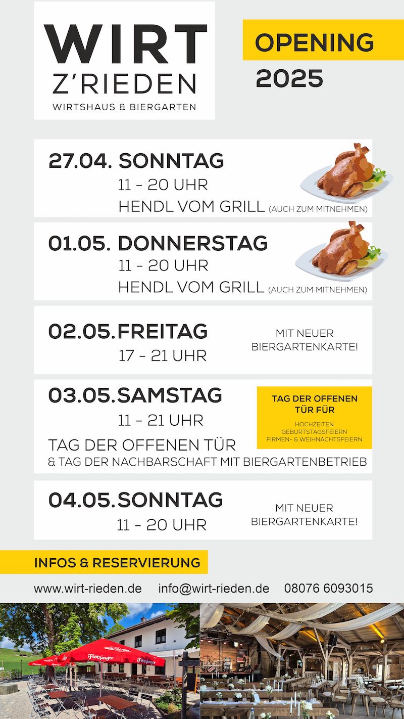 Der Biergarten in Rieden öffnet am Sonntag wieder seine Pforten. Das Wetter soll ideal werden und wird sicher den perfekten Rahmen zum Start in die neue Biergartensaison 2025 liefern. Und die Wasserburger Stimme ist mit dabei. Denn unsere Leser dürfen sich bei unserer Wochenenden-Verlosung auf einen tollen Preis freuen: Ein Tisch im Biergarten für Sechs mit sechsmal Frei-Hendl und sechsmal einem Frei-Getränk. Und so kann man mitmachen:
